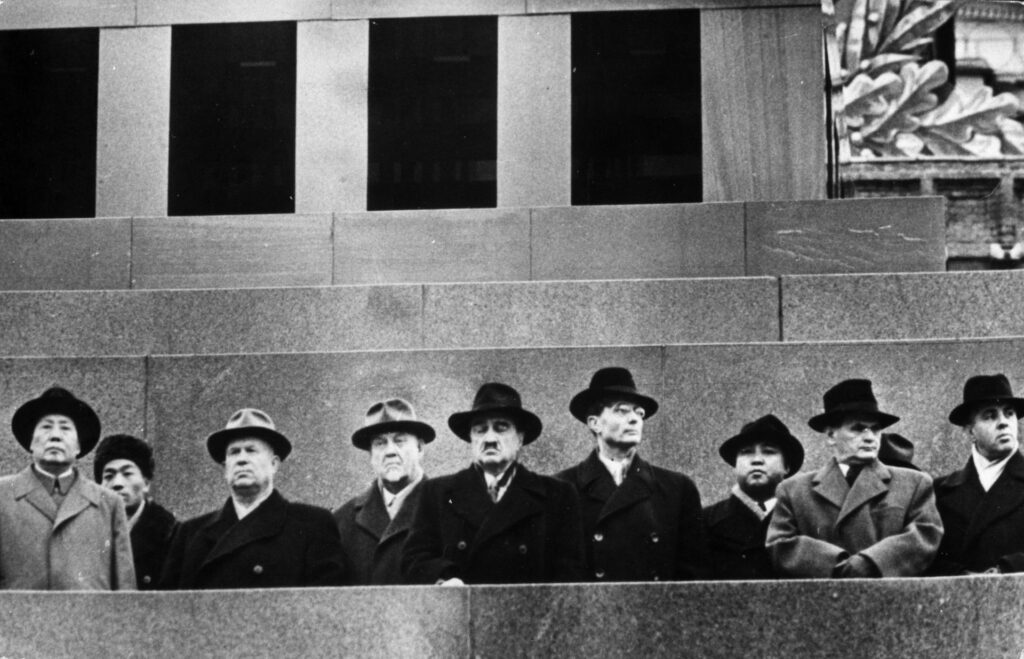 Assembled on the tribune atop the mausoleum that then housed both Vladimir Lenin and Josef Stalin, they watched the military parade through Red Square. Mao was accorded the spot of honor to the right of First Secretary Nikita Khrushchev.