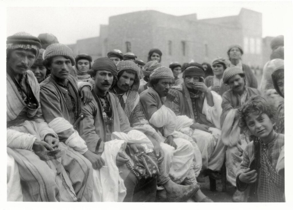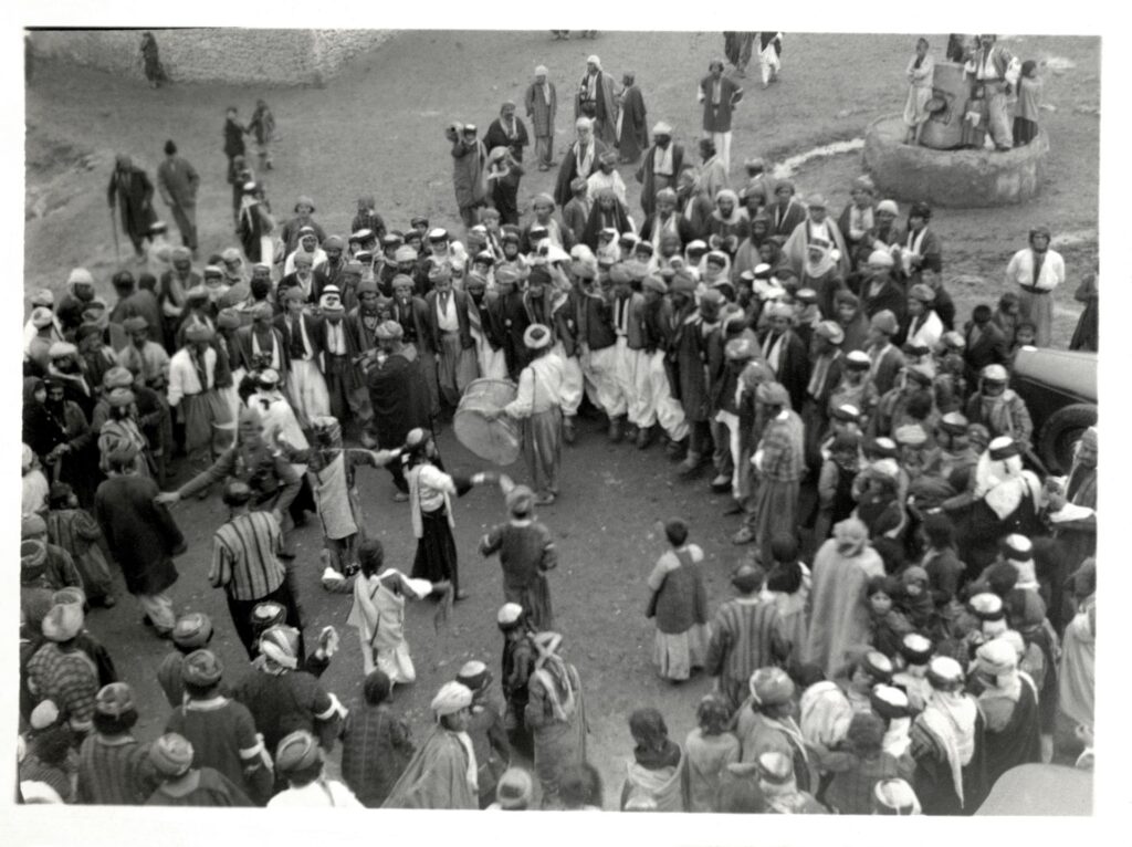 In contrast, the photographs in the University of Pennsylvania show a period of relative calm. Administered by the British under mandatory powers from 1921, Iraq became independent in 1932. Faisal al Hashimi, newly appointed as Iraq’s first king, made guarantees that ethnic and religious minorities would be protected, declaring, “Protection of life and liberty will be assured to all inhabitants of Iraq without distinction of birth, nationality, language, race or religion.” One of his goals was to forge a national identity that could accommodate the diverse religious and ethnic communities that lived within Iraqi territory. The wedding processions, communal dances and snapshots of village life in the photographic archive show Yazidis going about their lives in this political milieu, when optimism reigned and tensions were in abeyance.