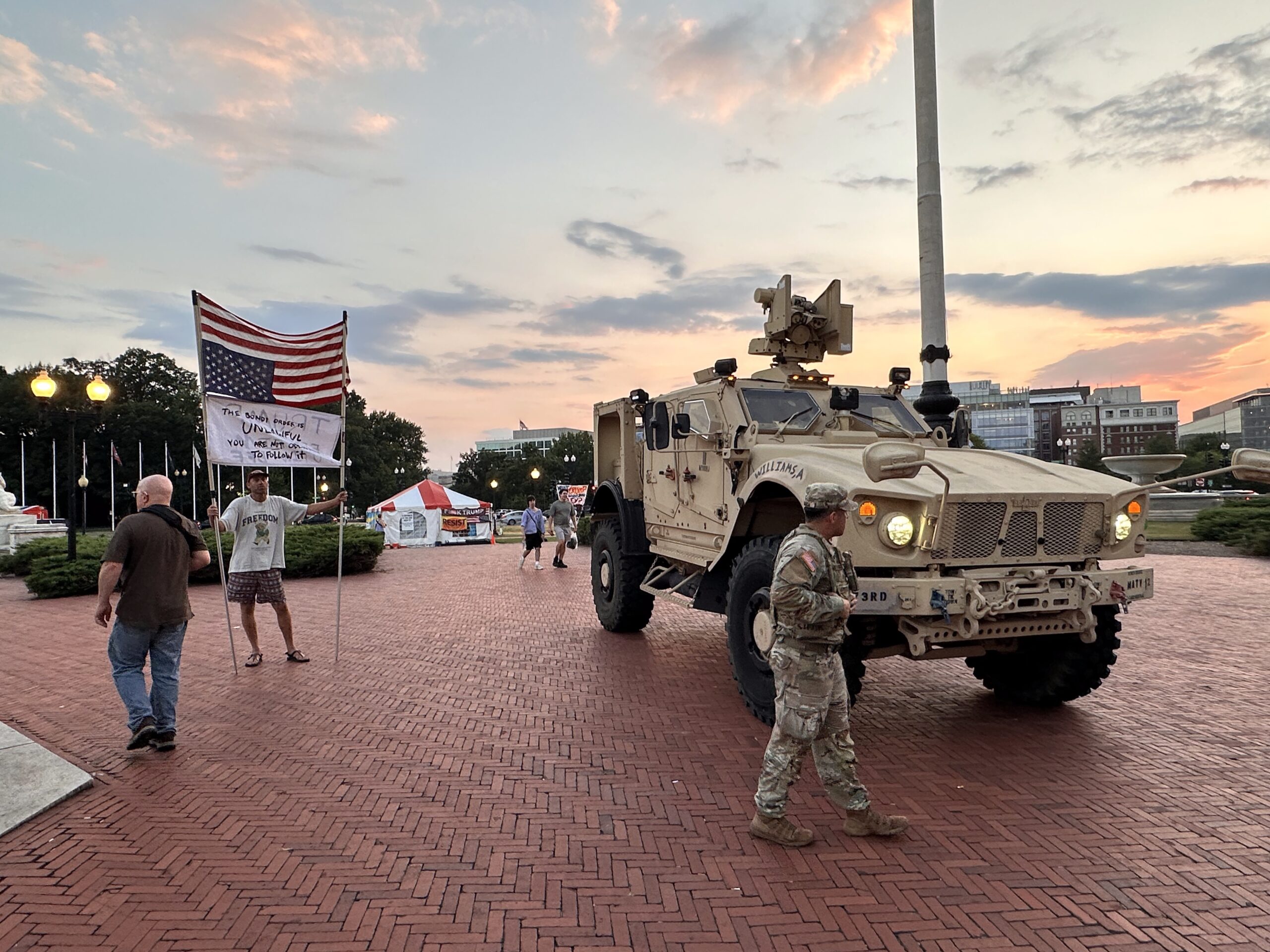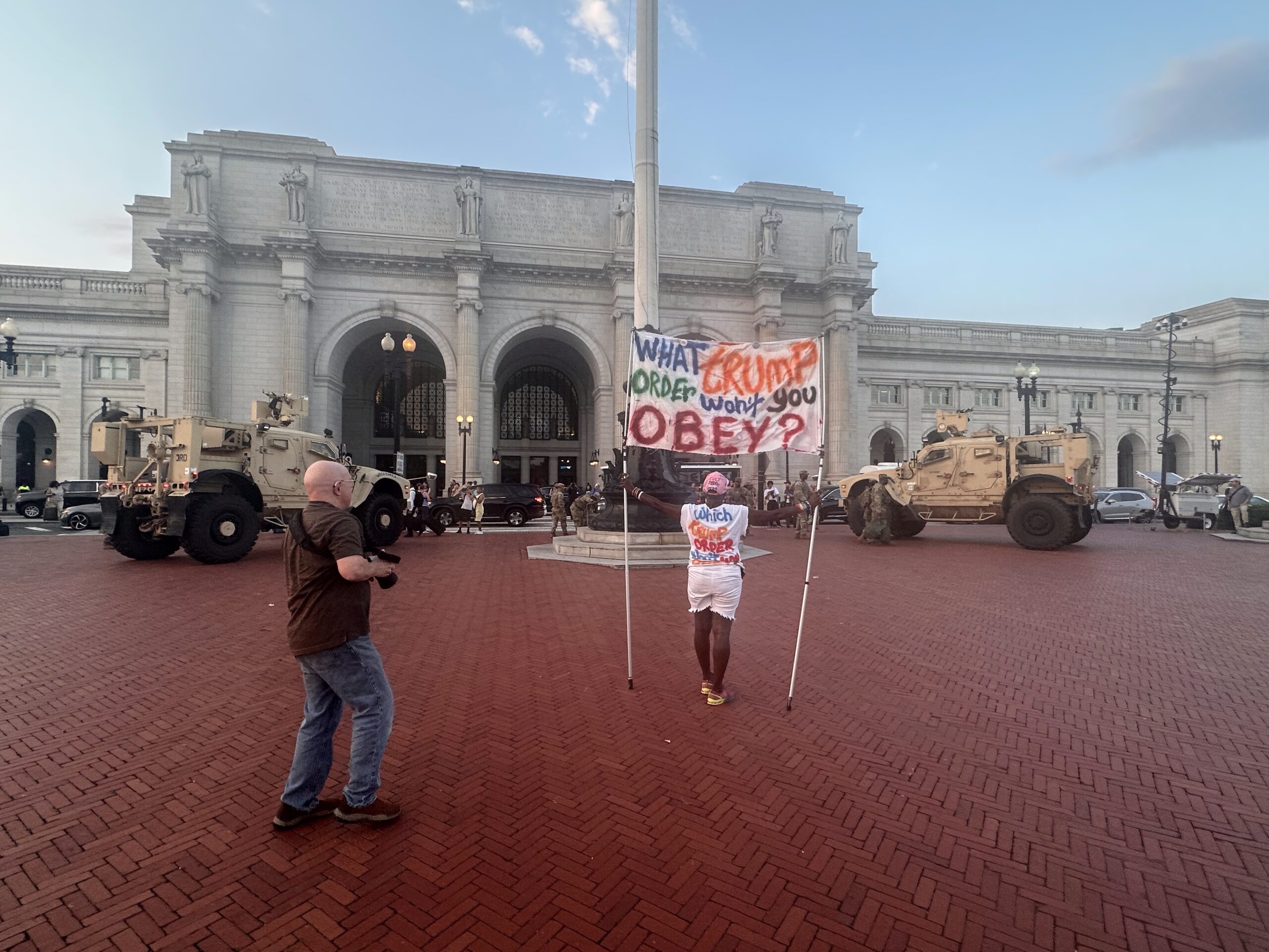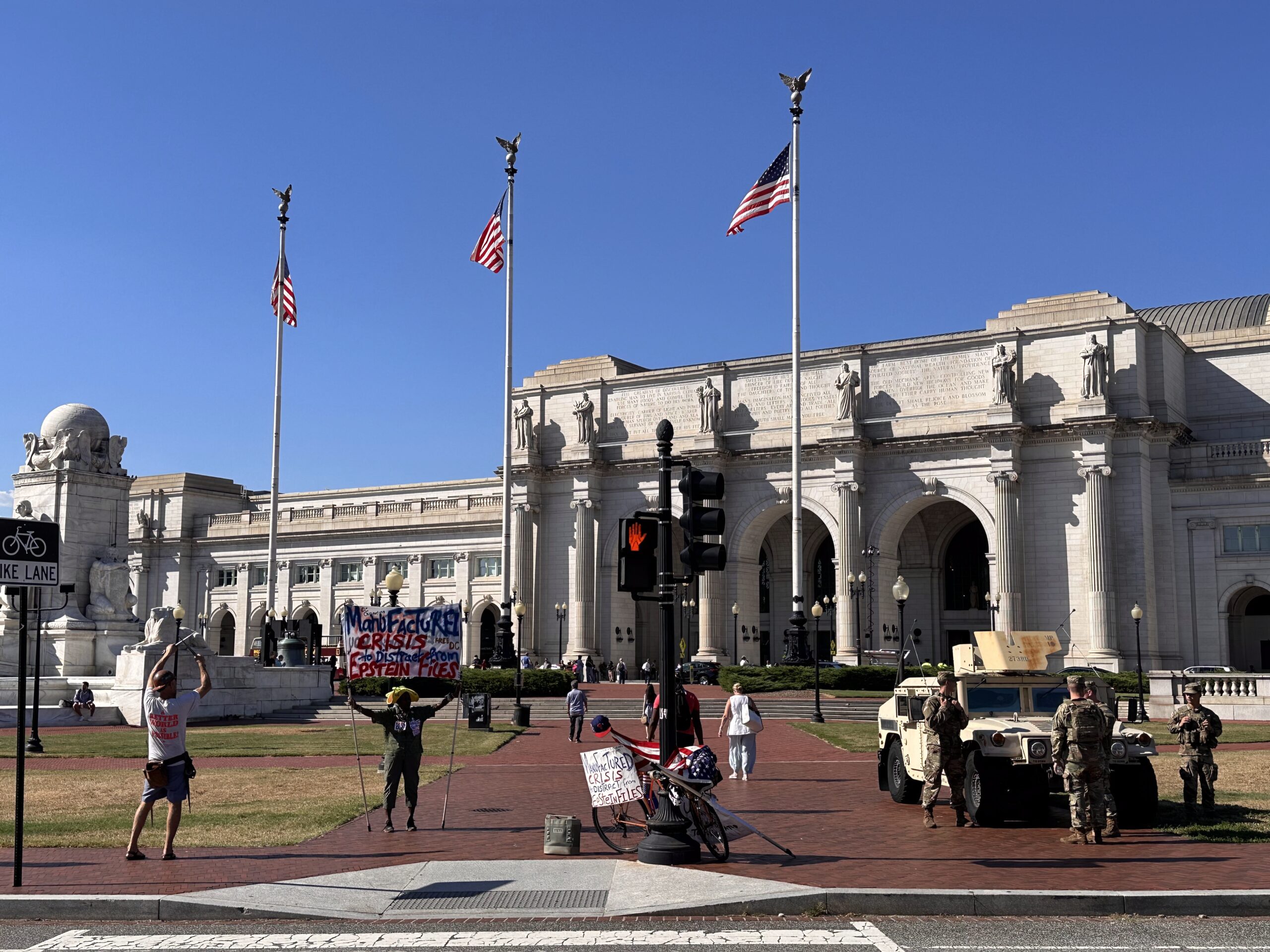 Back at Union Station, a few protesters circulated the scene, as locals and the few tourists now seen around town snapped photos of the National Guard troops, who stood at ease or strolled through the park. I’ve since seen them elsewhere in D.C., casually walking through well-manicured touristy areas and national monuments. If they were sent here to “fight crime,” they were nowhere to be found in the dicey parts of town.