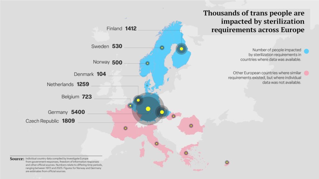At least 11,000 people across six European Union countries were subjected to compulsory sterilization or similar procedures as a prerequisite for legal gender recognition between 1972 and 2025, an investigation by New Lines and Investigate Europe reveals. This first cross-border figure is based on previously unreported official figures from Belgium, Czechia, Finland, Germany, the Netherlands and Sweden, where sterility was long an explicit prerequisite for gender recognition, considered the price one had to pay.