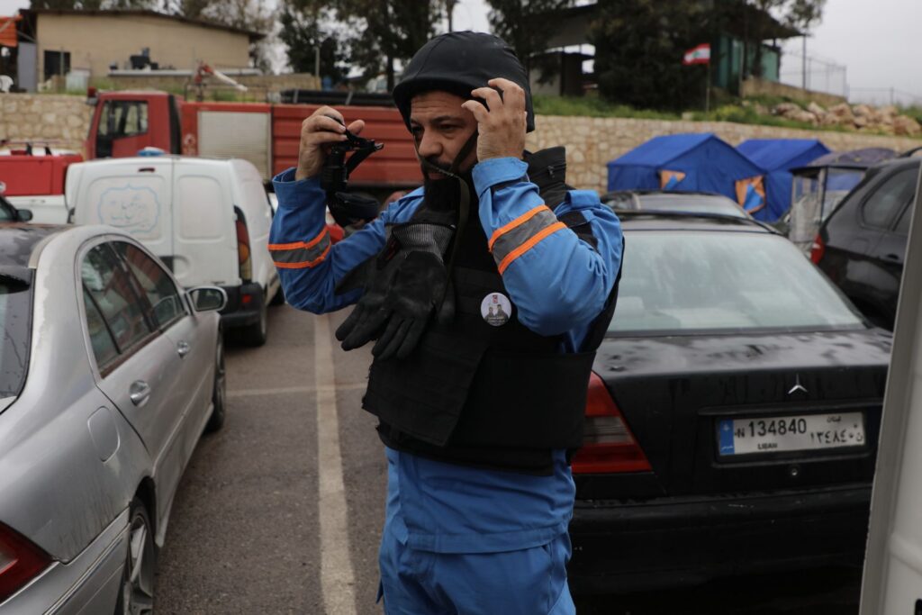 No first responders working in southern Lebanon are under any illusions as to the risks associated with their work. “When we go out for an airstrike, we wear our protective gear, like body armor and helmets,” Salloum says. This is placed over their bright blue overalls, adorned with Esaaf Al Nabatieh’s red crest. These are deliberate choices to make them stand out as much as possible.