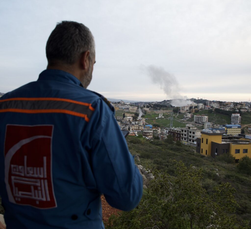 “They protect us from things like rocks and shrapnel, but not if a missile comes down on us.” On a previous emergency run, Salloum was close to being able to attest to that fact. “Once, I responded to a drone attack and they double-tapped” — the act of striking again several minutes after an initial strike, thus targeting first responders who arrive at the scene, a tactic that the paramedics report is being used multiple times every week — “but luckily the second missile didn’t detonate.” His words are almost drowned out by the impact of two Israeli missiles landing close by, in reply to a Hezbollah missile salvo launched from the vicinity of Nabatieh. Salloum talks on as if it is less than the sound of a buzzing mosquito.