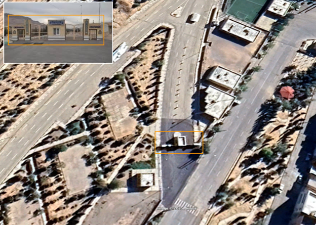 Images from the Iranian navigation app Neshan show signage that reads “Zibashahr Emergency Shelter (Traveler’s Camp).” The structure of the gates aligns with the one seen on satellite imagery from Airbus on Google Earth.