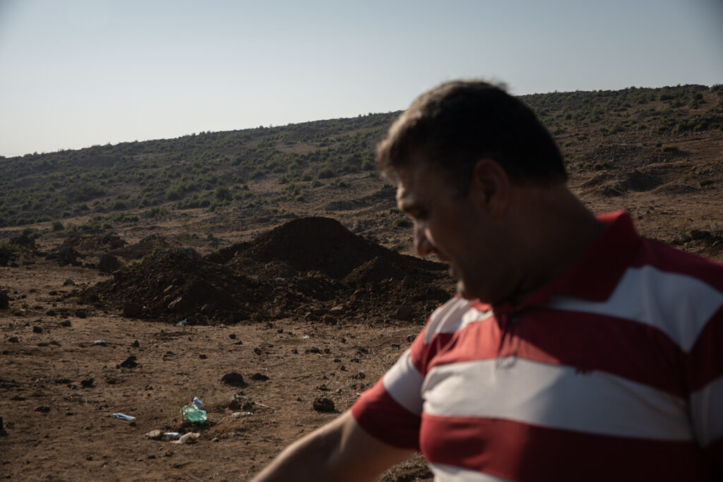 There’s an odd calm to this part of Sweida — less armed presence, fewer real indications of what the city has witnessed. I see that the mud of the grave is darker than the soil surrounding it, still fresh from being moved. Between the two raised mounds of soil that mark two ends of the grave is about 20 yards, a temporary home for those it holds. Abu Saab says they buried 149 unidentified people.