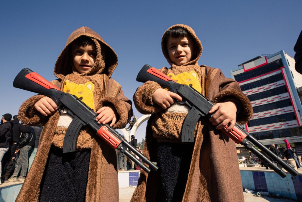 Around him, children waved flags and carried toy weapons in their arms. A 70-year-old woman said she did not sleep all night, out of “too much joy.” Draped in a violet robe, she repeated a refrain as she stood among a group of men: “Thank God. Thanks to those who liberated us, thanks to our brother Ahmad al-Sharaa.”