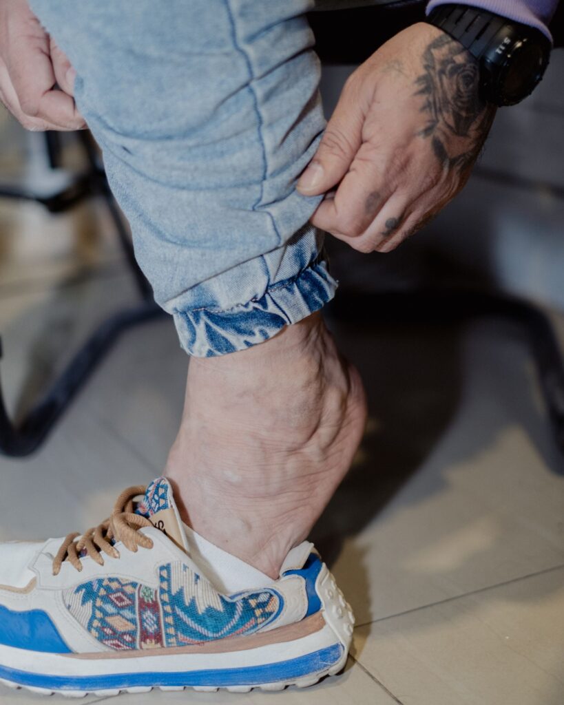 They repeatedly injected something into his leg, causing the flesh to swell. It still hurts, and today the ankle is swollen, the veins protruding. “I feel like one leg is shorter than the other.” That injection, he says, killed many prisoners. He still takes medication for his battered heart that endured numerous electric shocks.