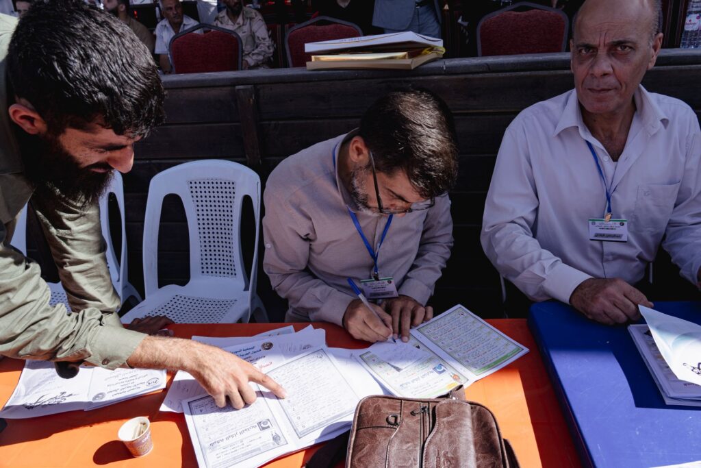 Dozens of soldiers have been mobilized for the event’s security. Unmoved by the crowd’s fervor, they remain on high alert. “They say ministers are coming, even the children of [interim President] Ahmad al-Sharaa,” exclaims Odai, a spectator.